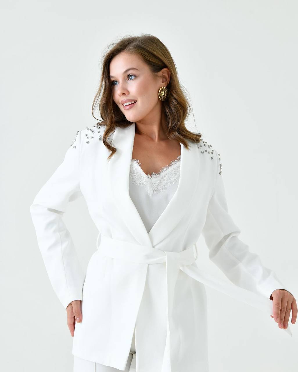 - نقاءٌ يُعزز الثقة: اللون الأبيض الناصع ليس مجرد لون، بل هو رمز للنقاء والاحترافية والثقة. يمنحكِ هذا الجاكيت إطلالة مشرقة ومُلفتة، ويُناسب تمامًا المناسبات الهامة كحفلات الزفاف، حفلات الكوكتيل، أو عشاء العمل الرسمي.
