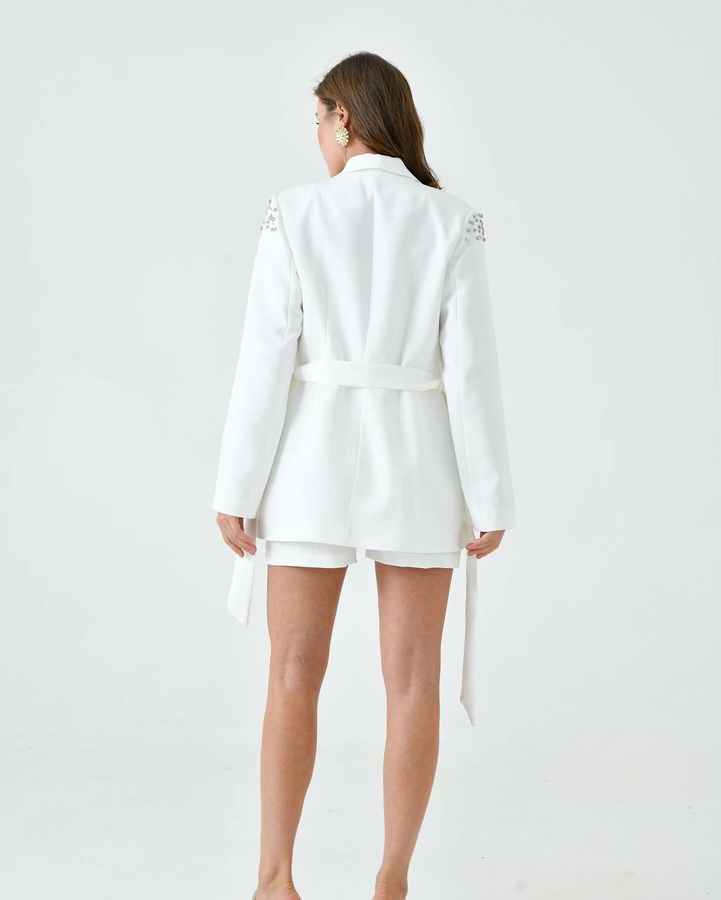 - تطريز ثلاثي الأبعاد: الكتفين مزودان بتطريزات كريستالية متناثرة بعناية، مما يخلق تأثيرًا بصريًا ثلاثي الأبعاد يُضفي لمسة من البريق الفاخر ويجعل الجاكيت قطعة فنية قائمة بذاتها. هذا التفصيل الدقيق يضمن لكِ التميز عن الآخرين.