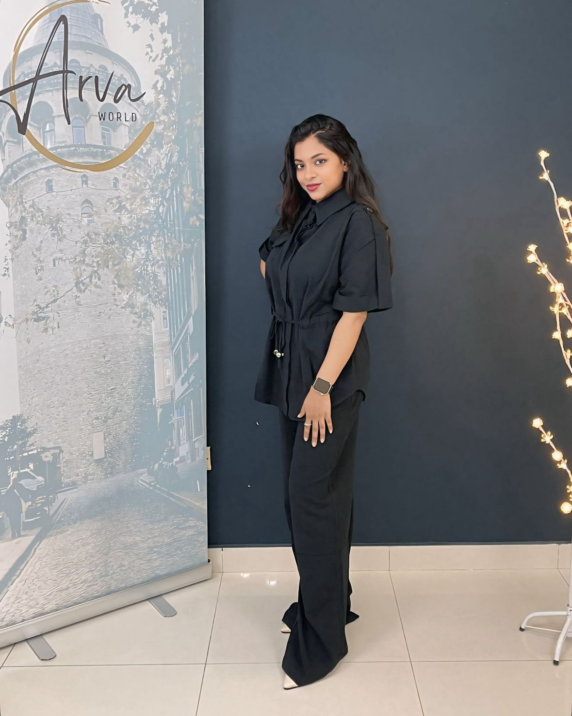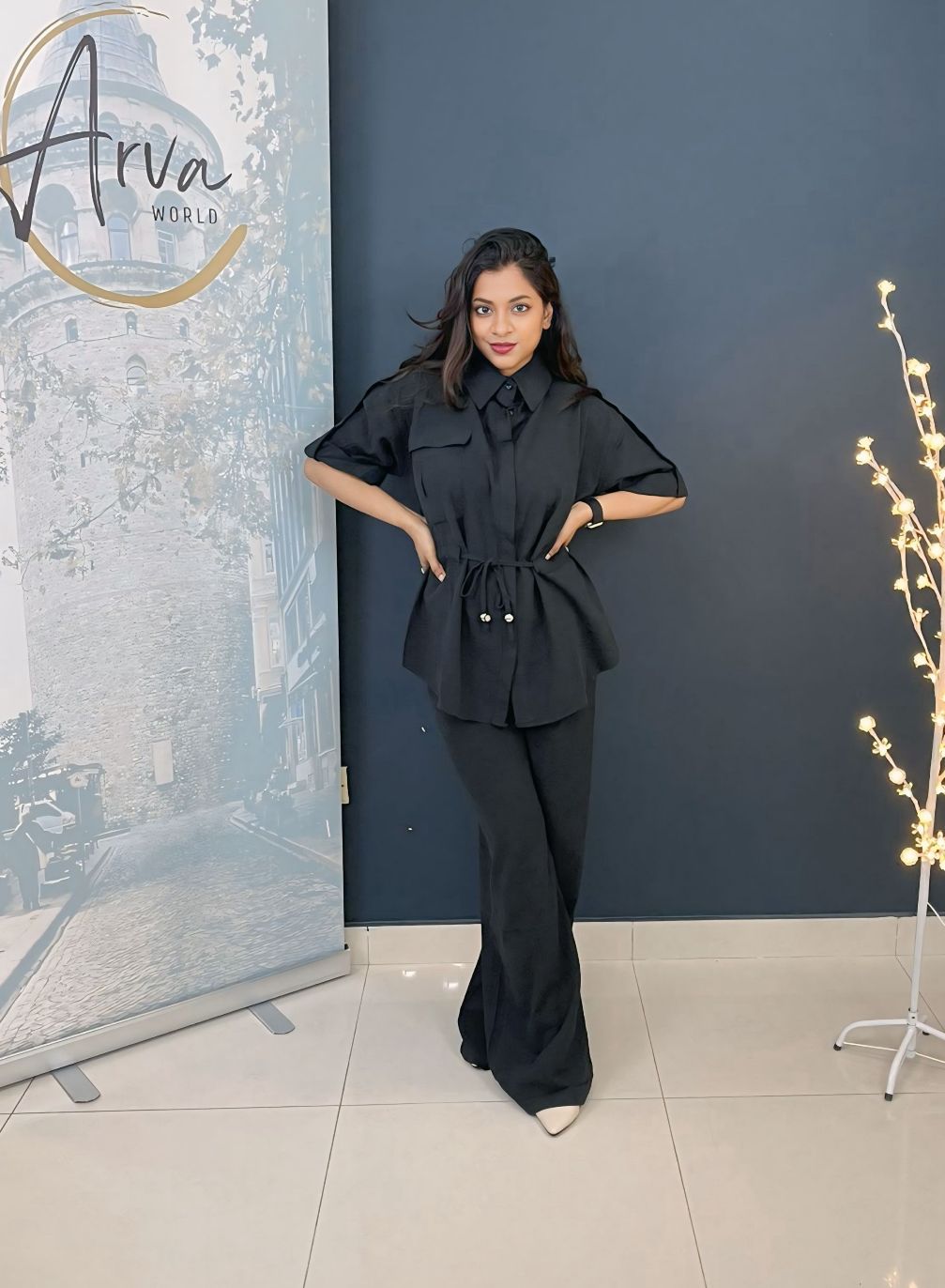 يتميز القميص بقصته المريحة مع جيوب أمامية كبيرة وياقة كلاسيكية، بينما يضيف رباط الخصر القابل للتعديل لمسة أنثوية ساحرة تبرز جمال قوامك. ويكتمل الطقم ببنطلون واسع الساقين ينسدل بنعومة ليمنحكِ حرية حركة ومظهراً راقياً.