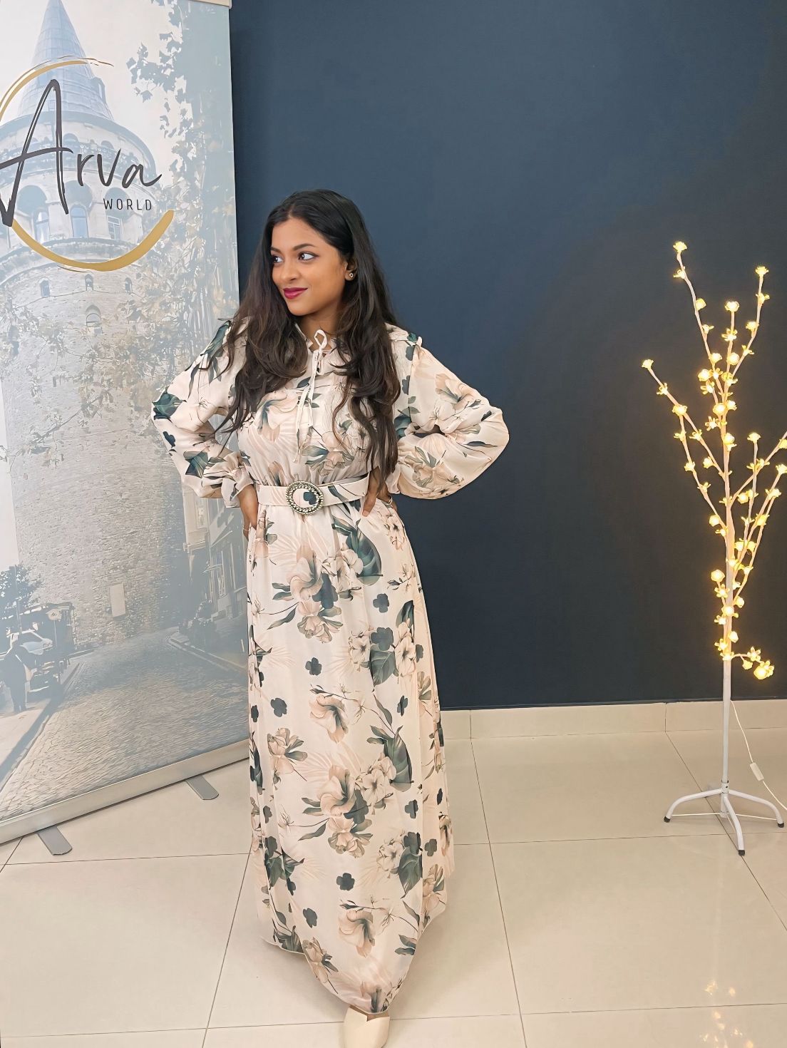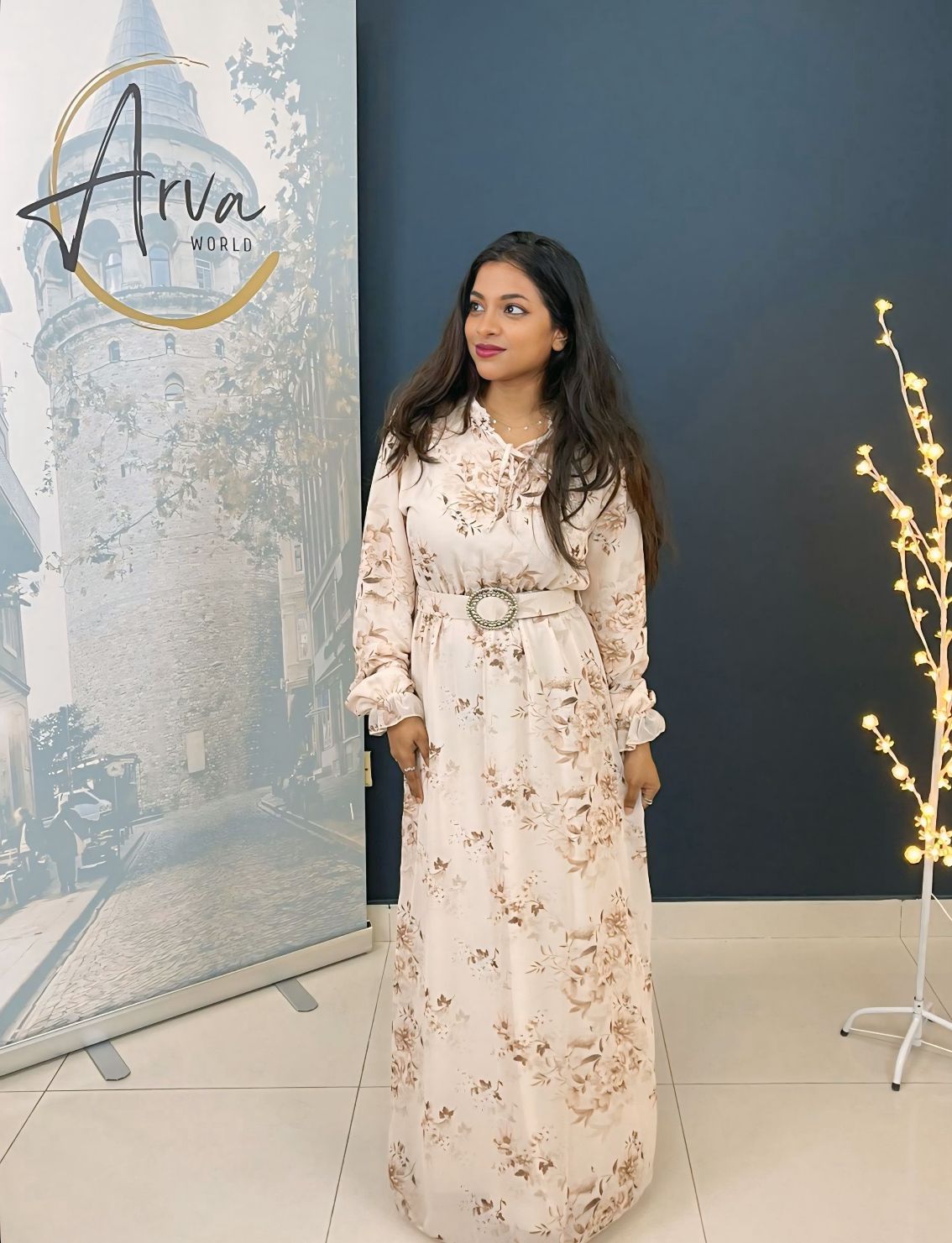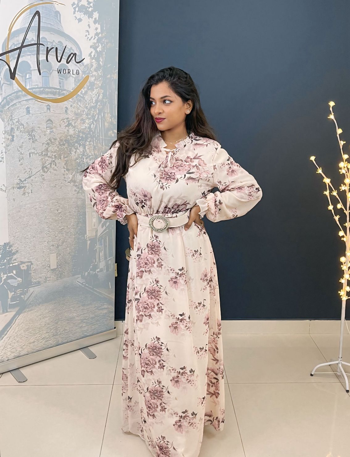 مع هذا الفستان ستشعرين أنكِ في لوحة فنية أنثوية من الأناقة والنعومة، بفضل خامة الشيفون الانسيابية وتصميمه العصري الراقي.